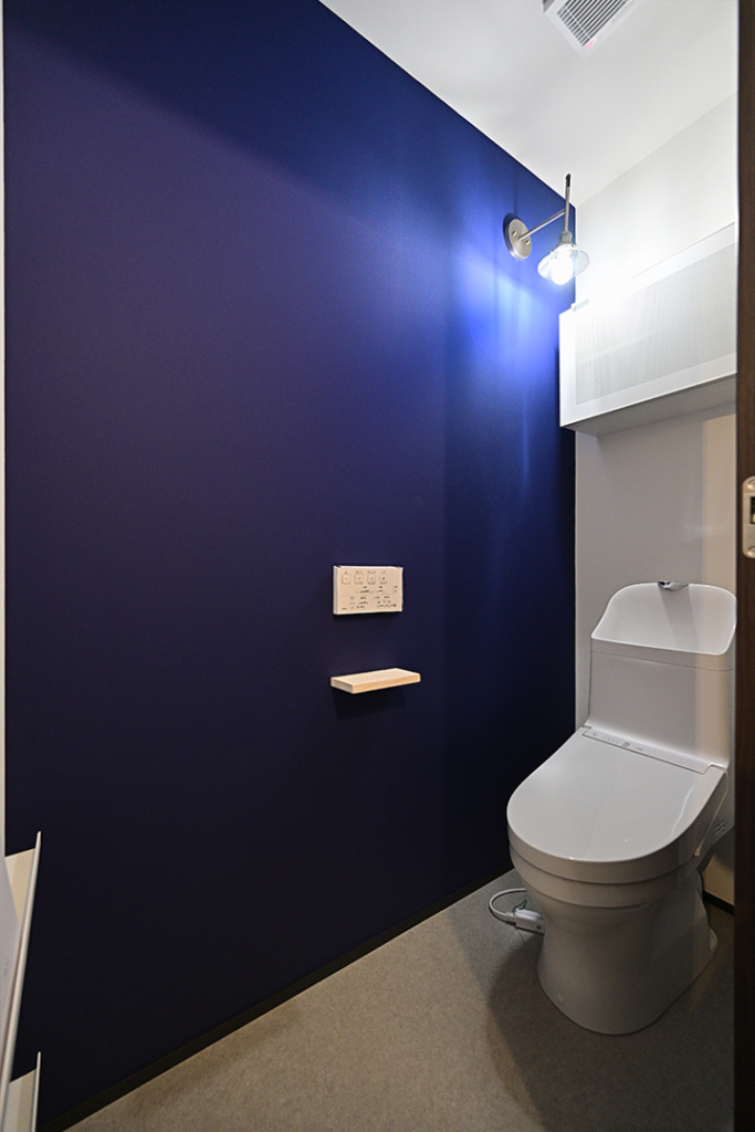 お家全体の雰囲気を壊さないよう、二階のトイレはこっそりドラゴンズブルーのアクセントクロスを使用。