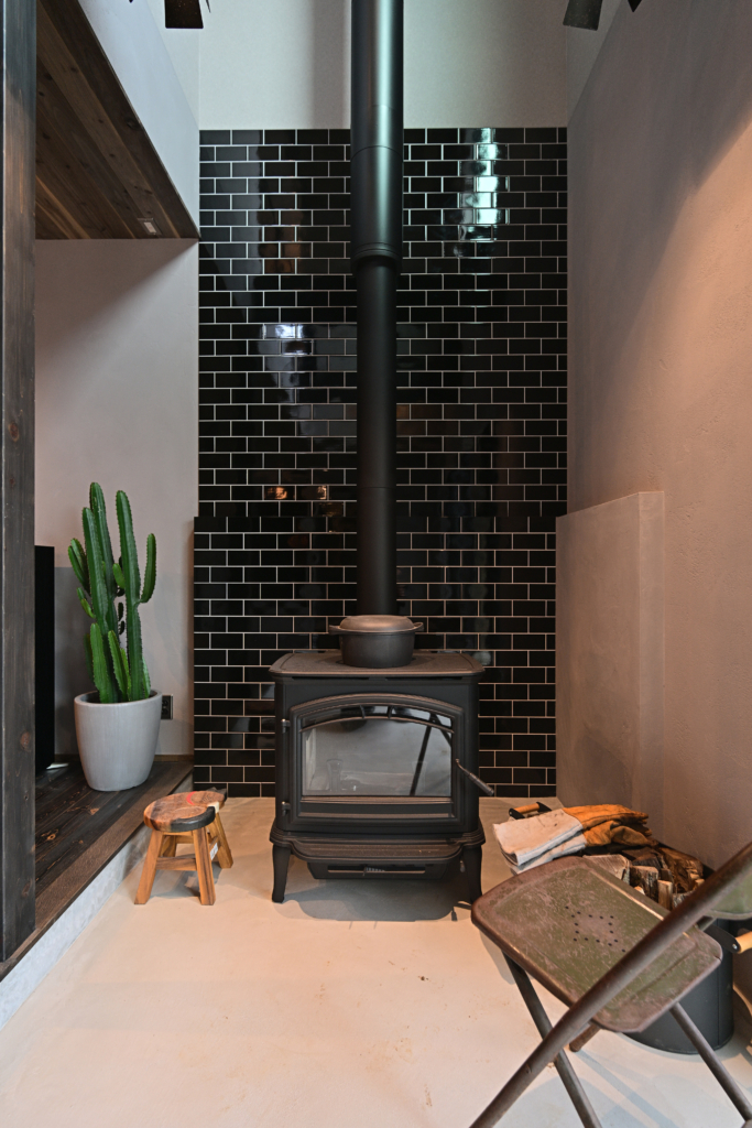 リビングの横には6帖の土間スペースとアメリカの武骨な薪ストーブ。
