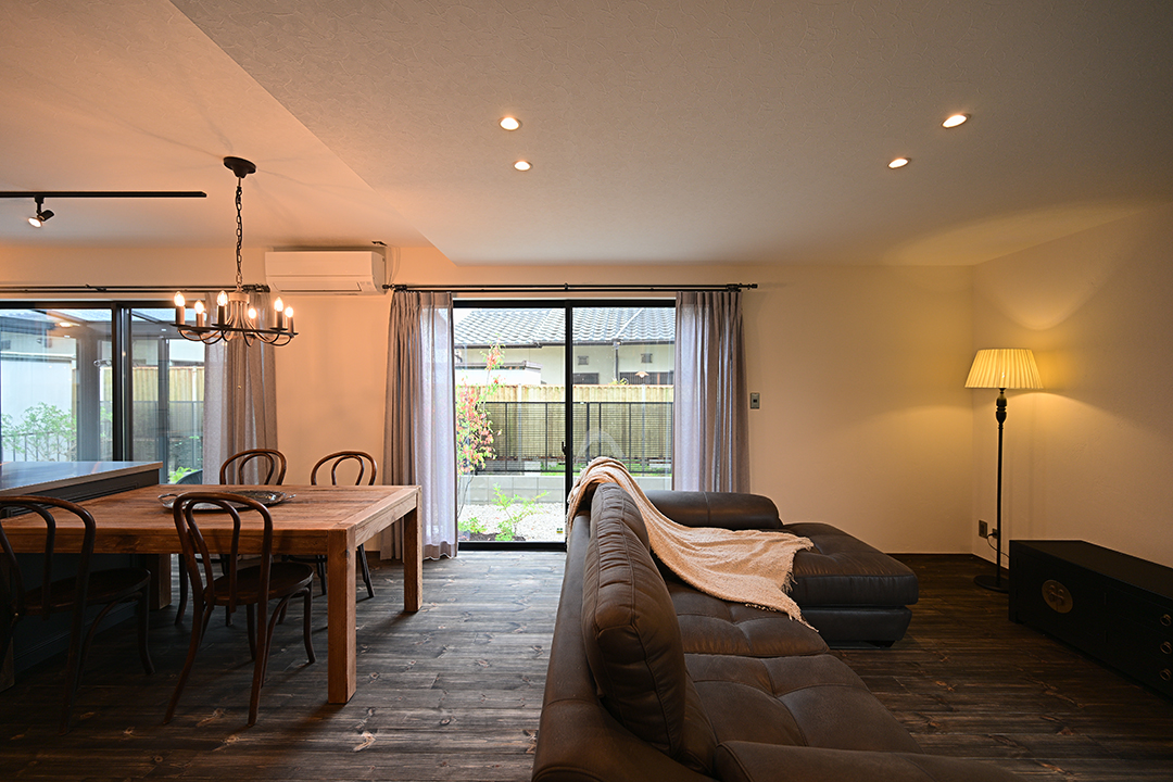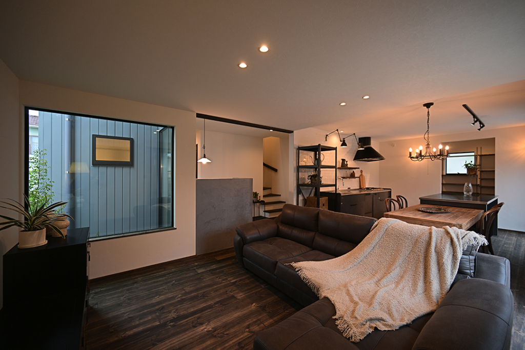 リビングはグレアレスのダウンライトとスタンドライトの柔らかい灯りで