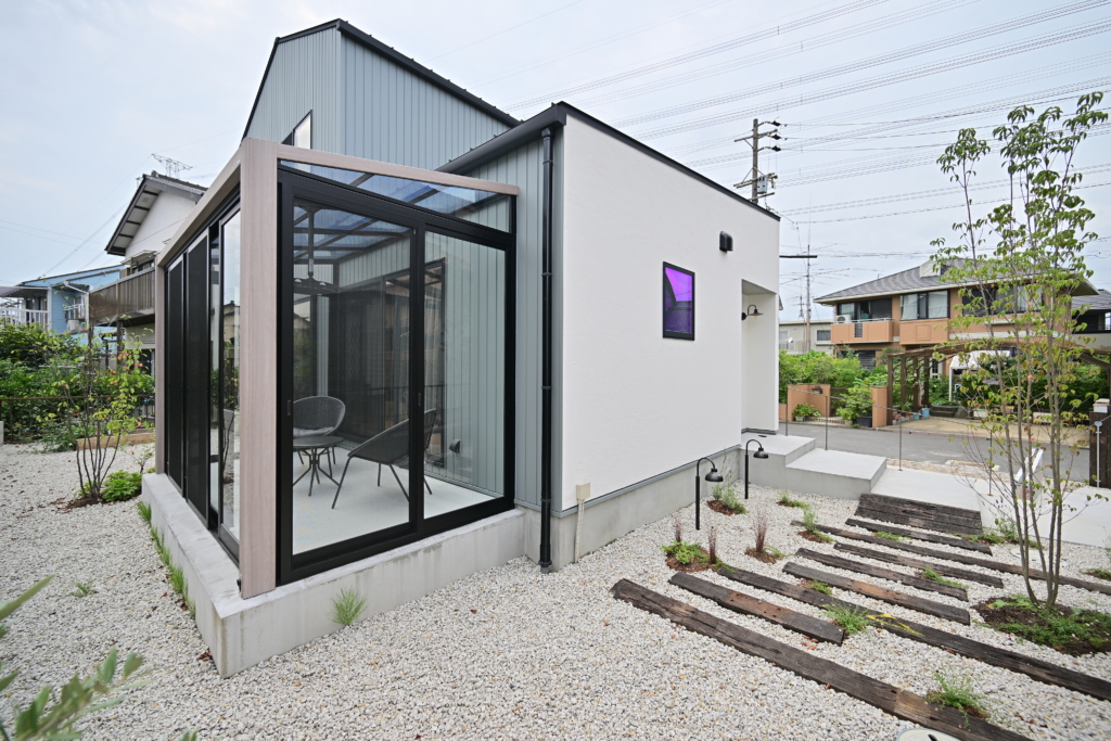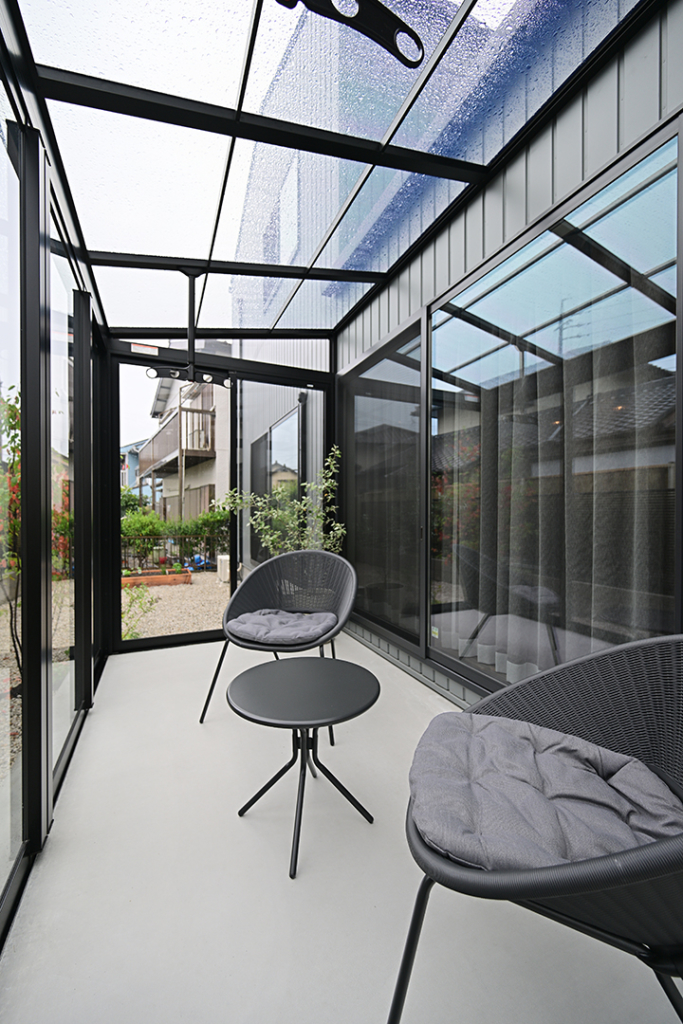 雨が降っても安心なサンルームでは洗濯物を干すのはもちろん、お庭の眺めてリラックスできます。