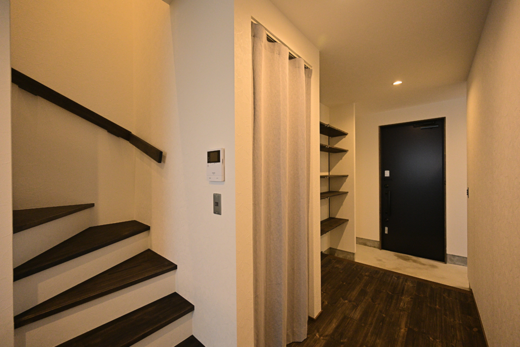 玄関の収納はおでかけの際にすぐものが取れるようにカーテンで間仕切りしました。