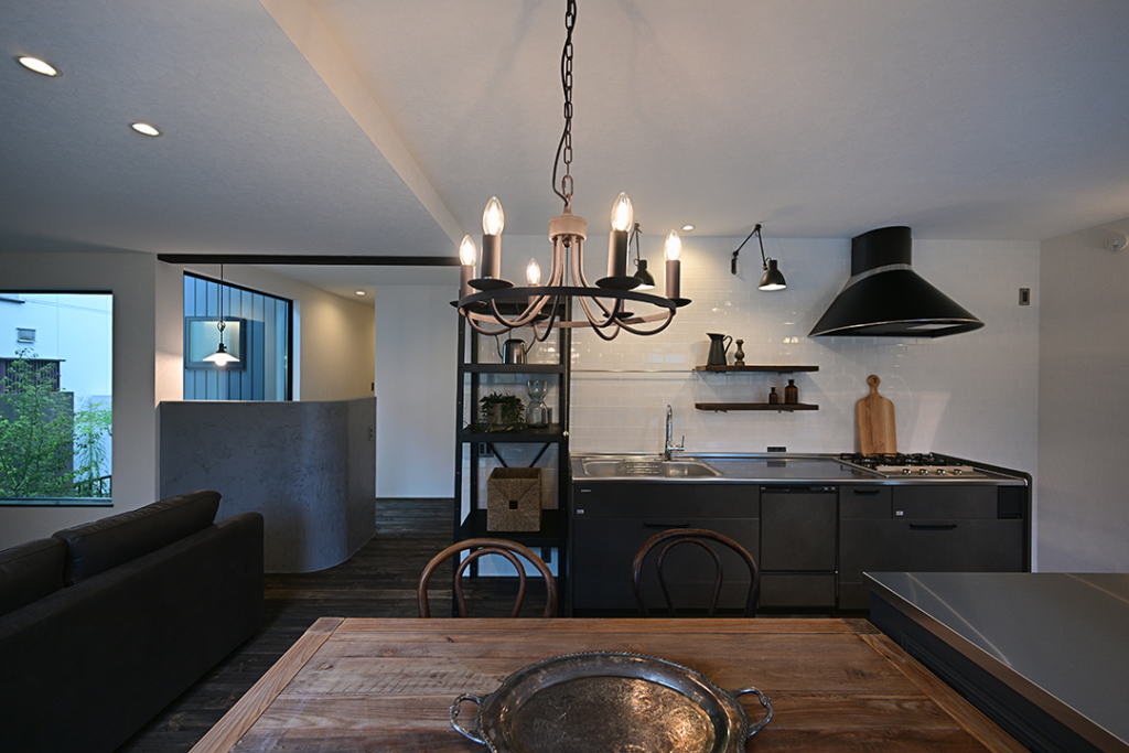 モノクロの清潔感と古材を使用したテーブルを対比的にして木の優しい雰囲気にしました。
