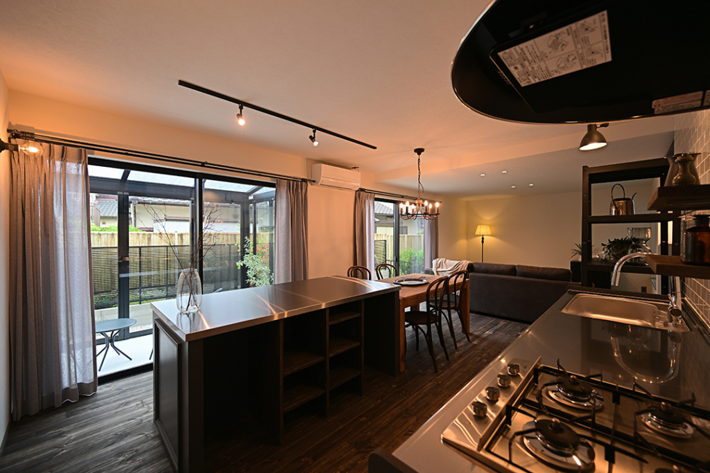 キッチン前の窓からは庭のサンルームに出られます。