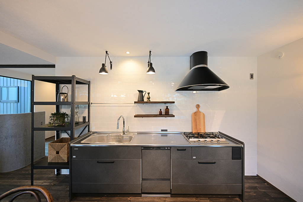 キッチン前面は一面タイル貼りにしました。水はねと油はねをしてもサッと拭くことができます。