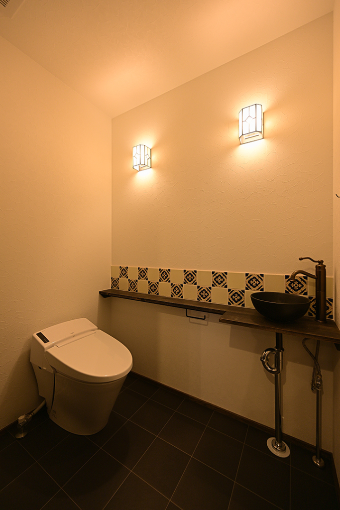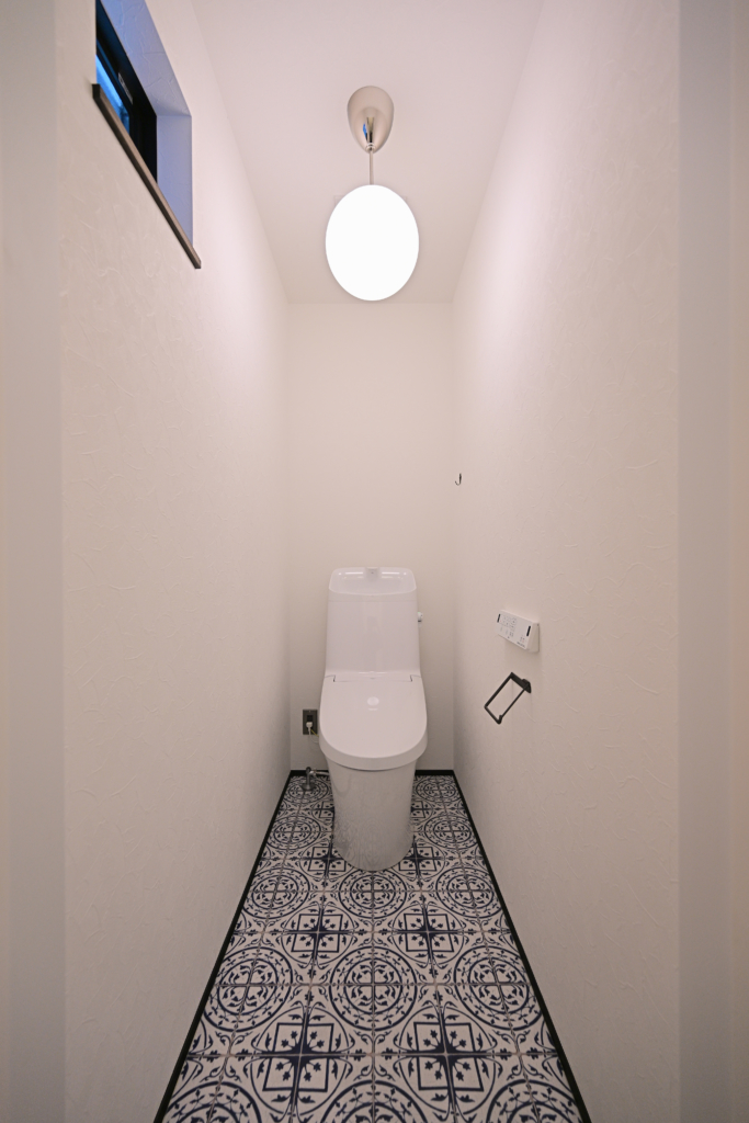 1Fのトイレのメキシカンタイルと似た雰囲気の模様のあるクッションフロアをアクセントに。