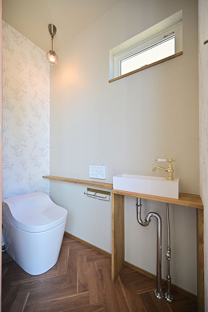 1Fのトイレです。花柄のアクセントクロスが可愛らしくナチュラルな印象を与えてくれます。