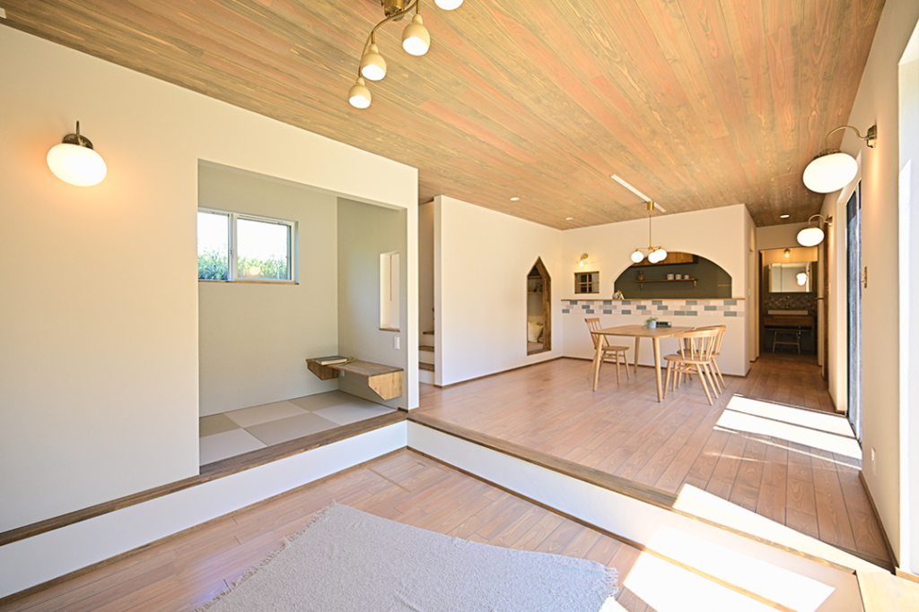 リビングダイニングの床は松の板張り、天井は杉の板張りとなっています。