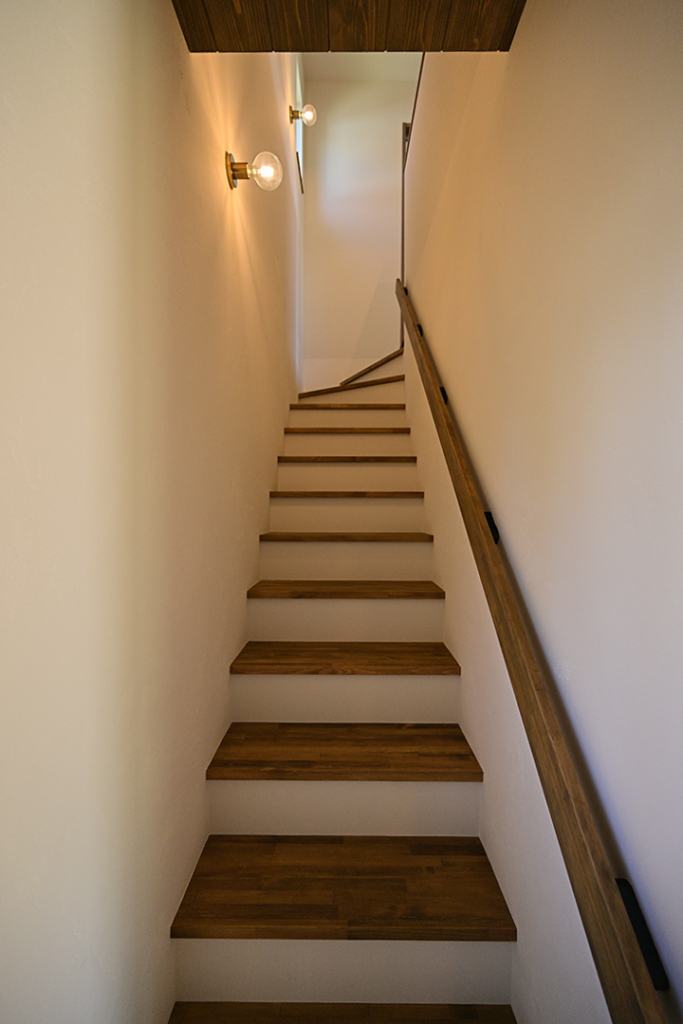 階段の照明は、LEDの壁づけライト。壁に映る影も可愛いです。