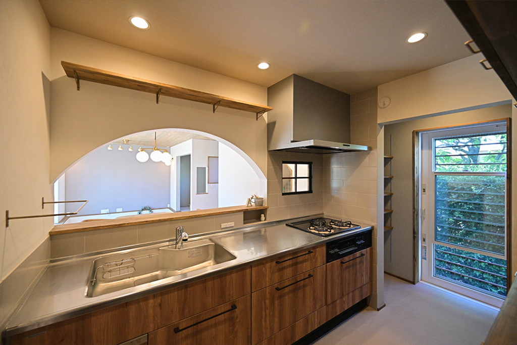 可愛らしいカフェをイメージした、R垂れ壁でキッチン窓と小さな造作窓。