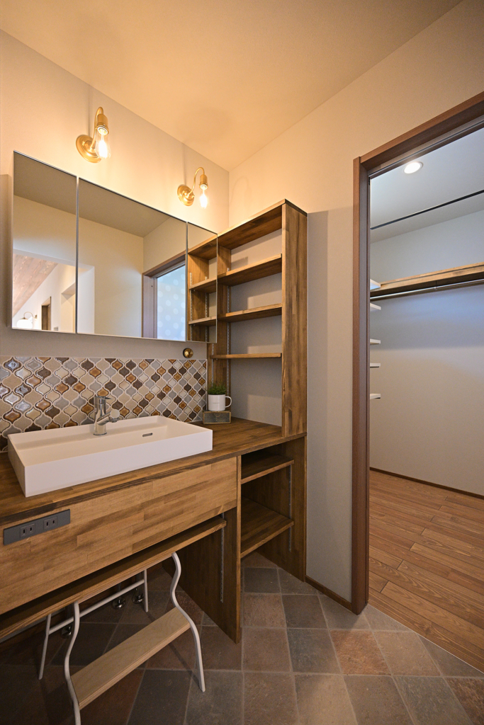 名古屋モザイクのコラベルタイルが目を惹く洗面スペース。