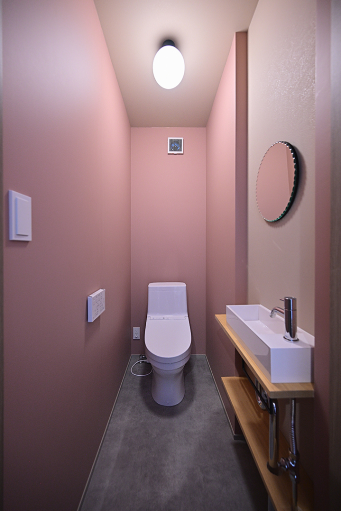正面の壁にはアクセントクロス(サンゲツ FE74008)、鏡はお施主様の支給品です。