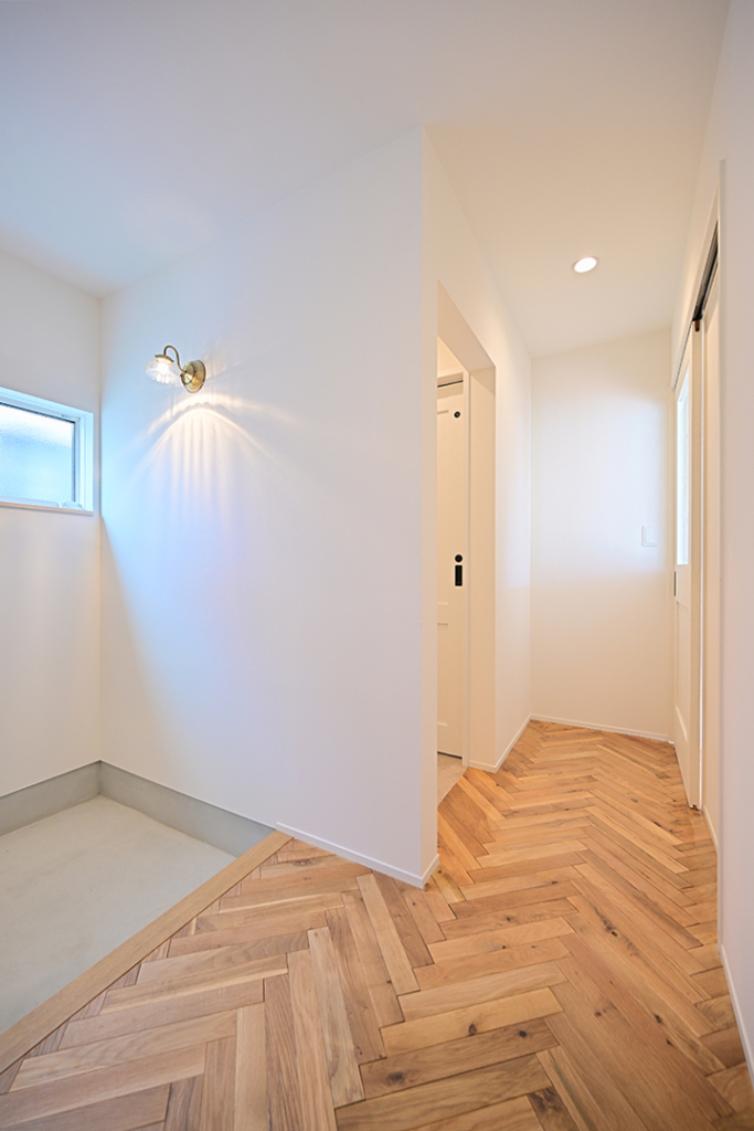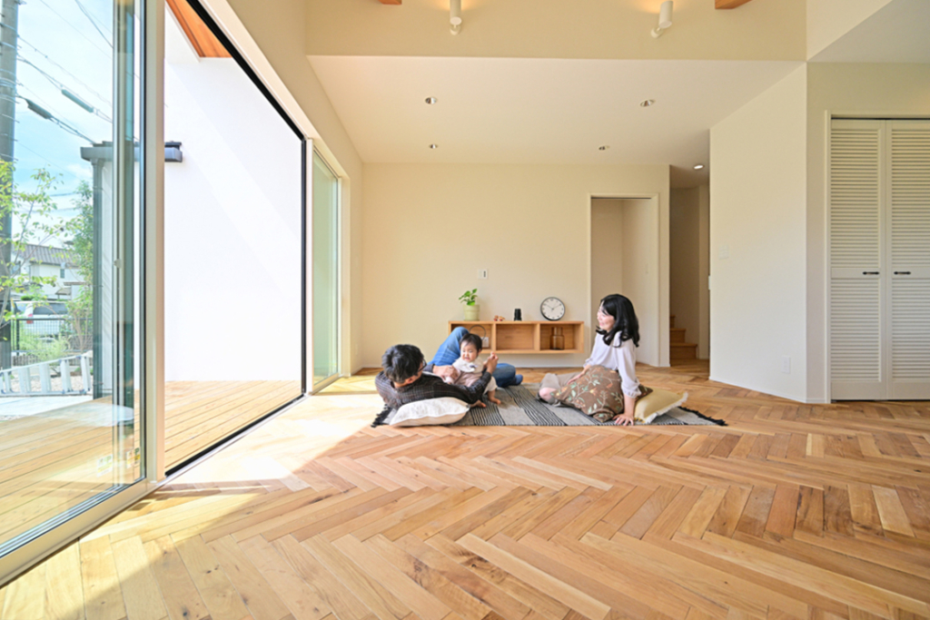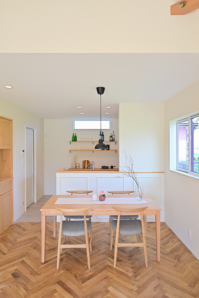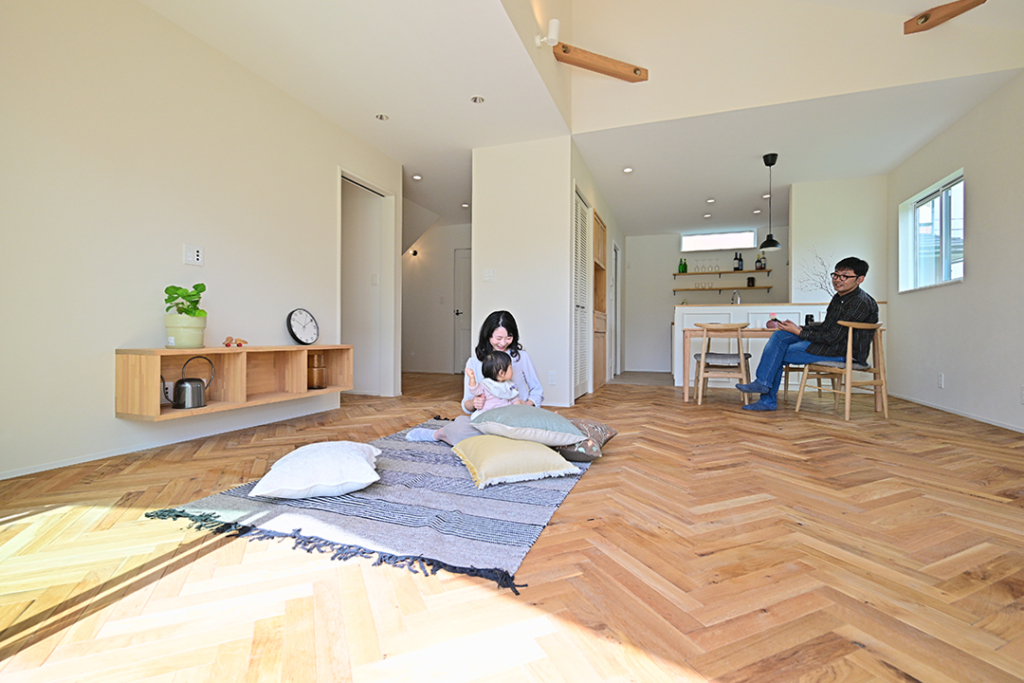 ヘリンボーン柄に組み合わせたリビング・ダイニングスペースの床には、柔らかく温かな印象の無垢材を使用。