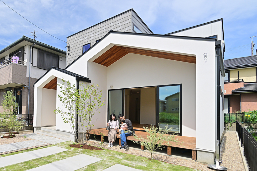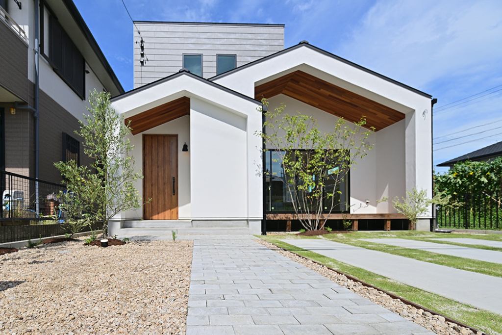白を基調とした、シンプルな色味と可愛らしい三角屋根のカバードポーチが印象的な外観。