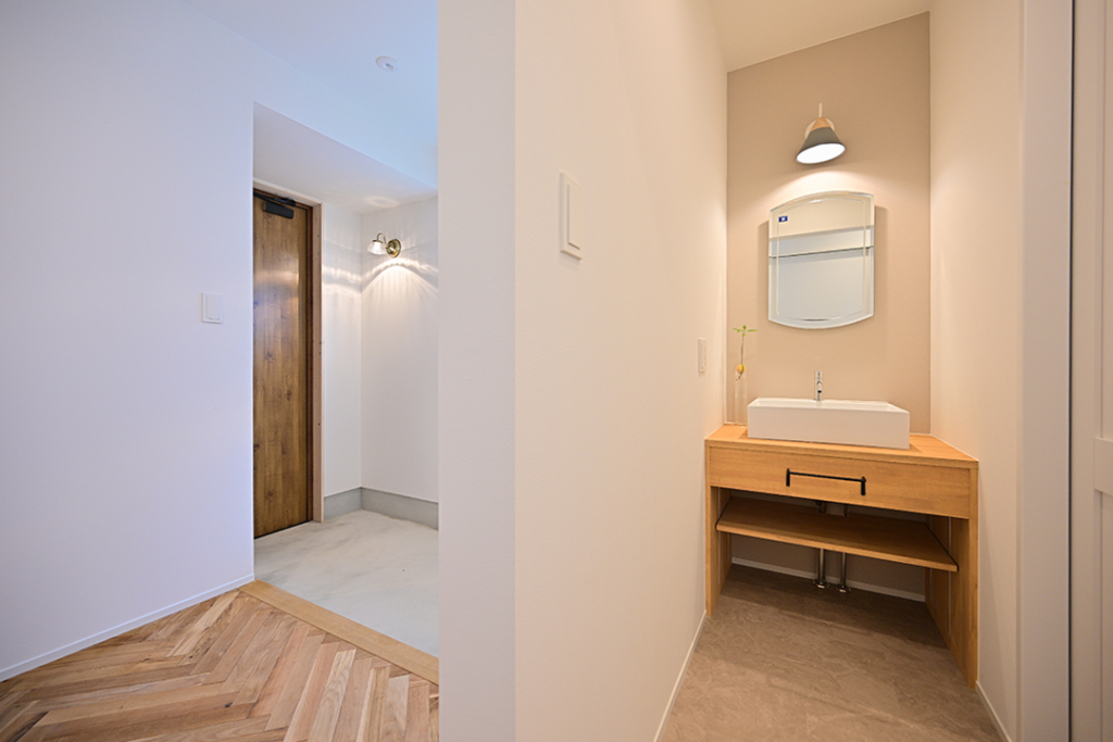玄関入ってすぐの廊下に設置したセカンド洗面台。トイレの手洗いも兼ねています。