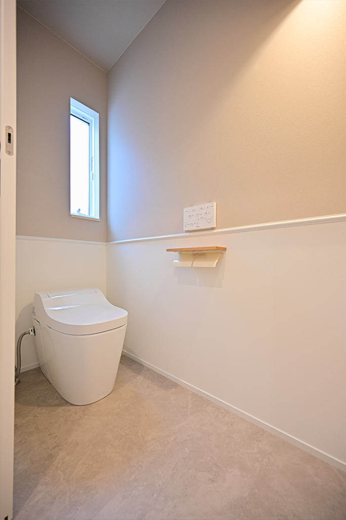 1階のトイレは壁紙を上下で切り替えして、やわらかい落ち着いた雰囲気に。