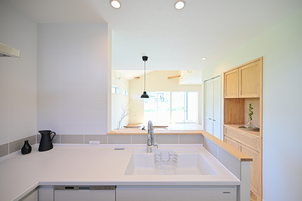 Lの字のキッチンを採用することで、作業しながらリビングの様子も伺うことが出来ます。