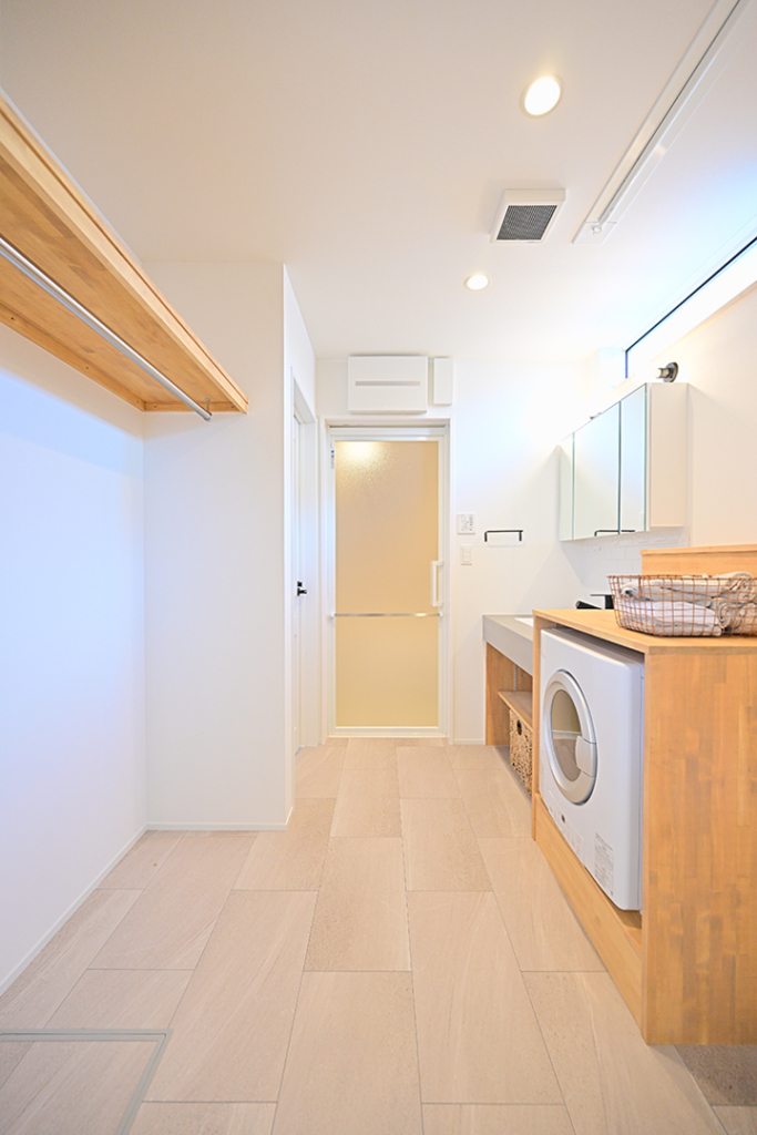 ランドリースペースを広く取り、部屋干しもできるポールも設置。