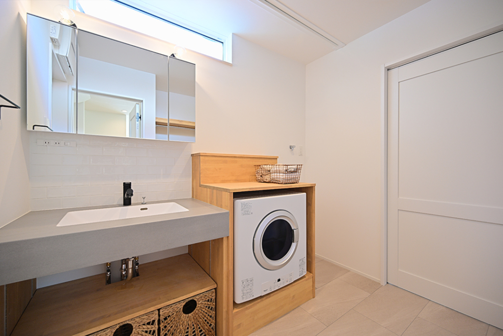 洗面台と幹太くんの収納スペースはホロスホームで造作しました。