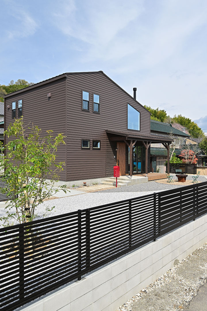 外壁はブラウンのガルバリウム、カバードポーチ部分は本物の木材を使用しています。