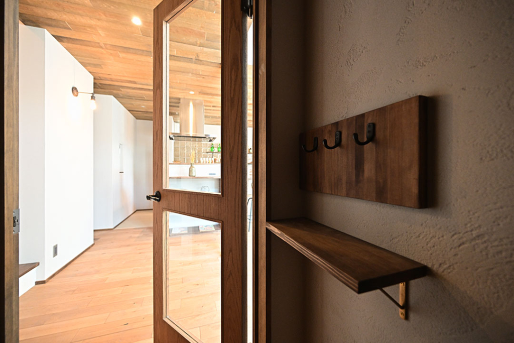 玄関とLDKを繋ぐ、玄関の閉塞感を補う見透しある上下ガラスの輸入ドアもこだわりポイントです。