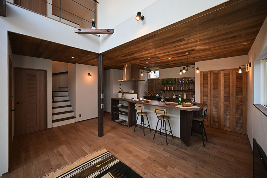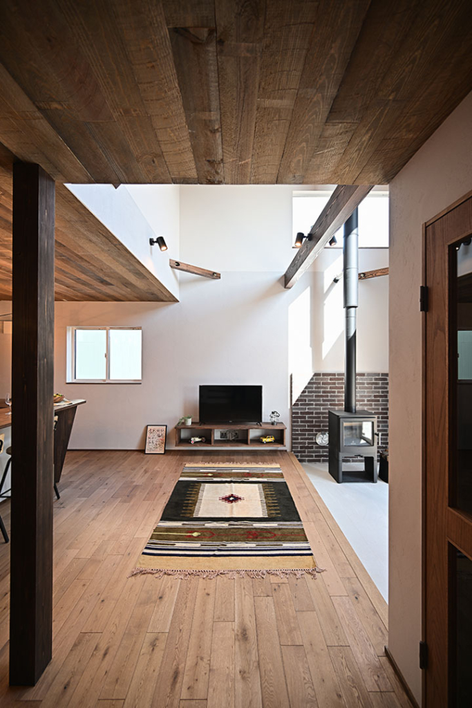 LDKの天井は黒鋼色の古風板、床はオークの無垢フローリング、
