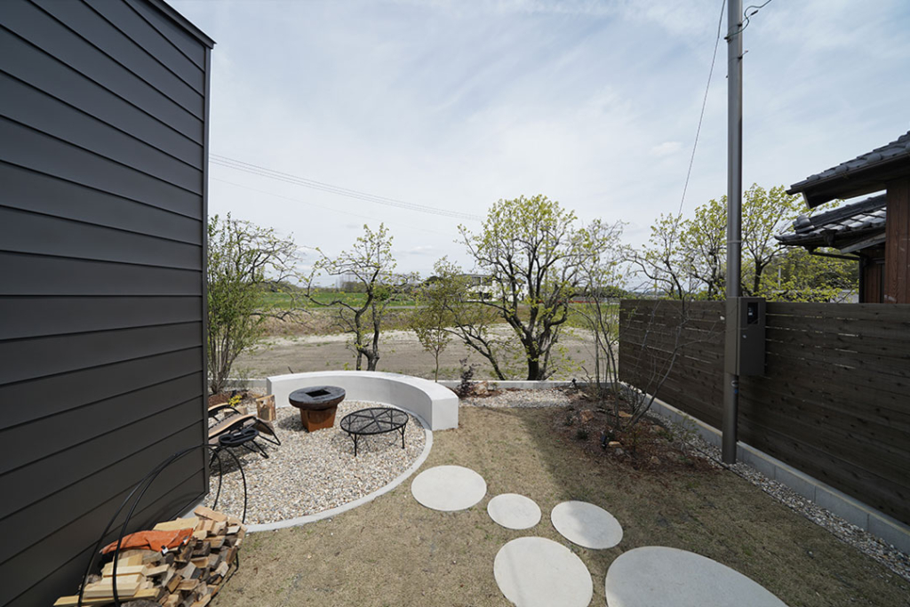 ベビーカーもスムーズに通れるコンクリートのアプローチ+枕木でデザイン性もUP。