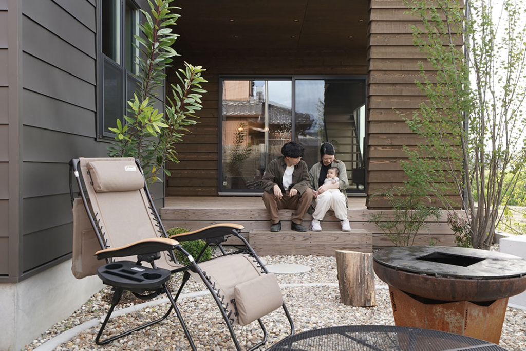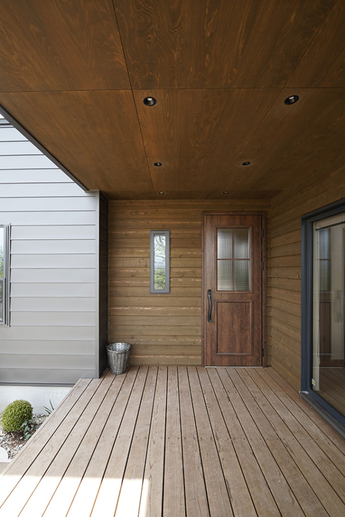 ウッドデッキと玄関ポーチを兼ねて省スペースに。