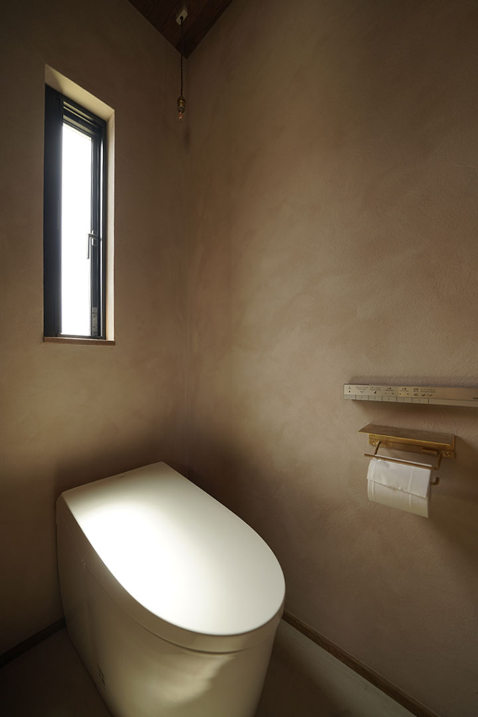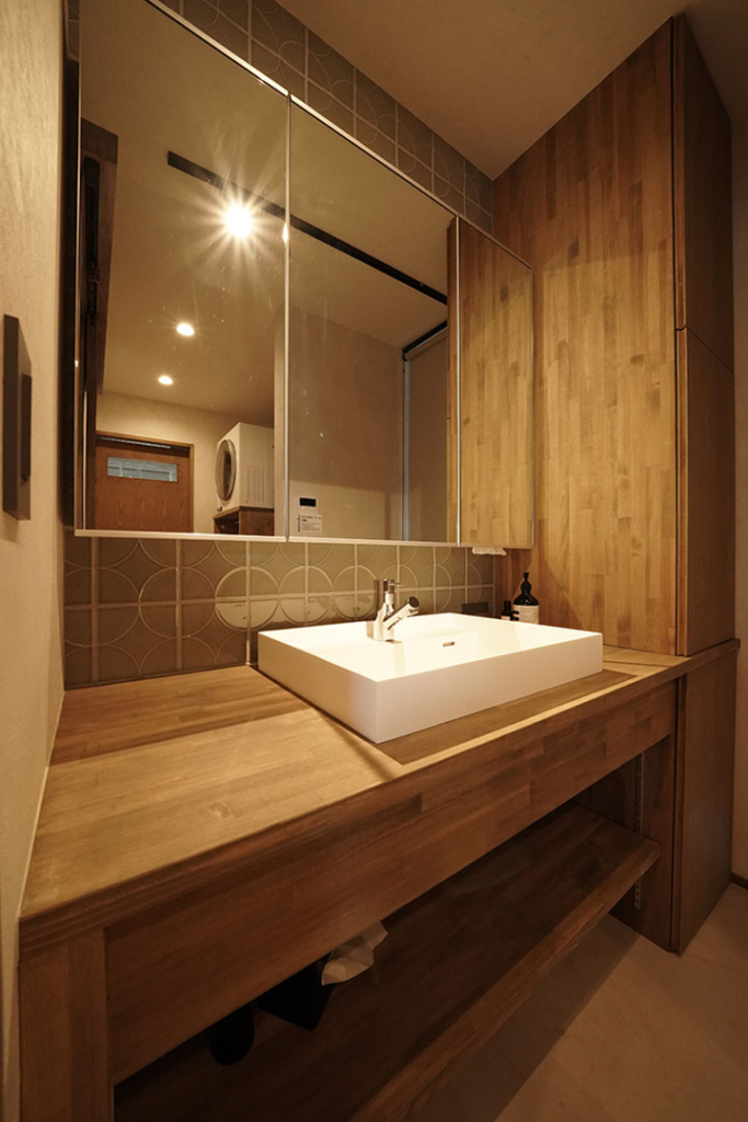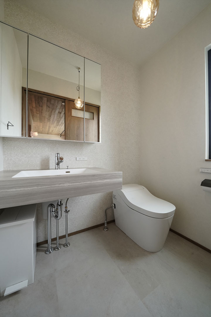 朝の支度も2階で完結できるよう、広めの手洗い洗面付きトイレには三面鏡も設置。