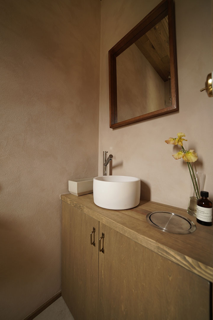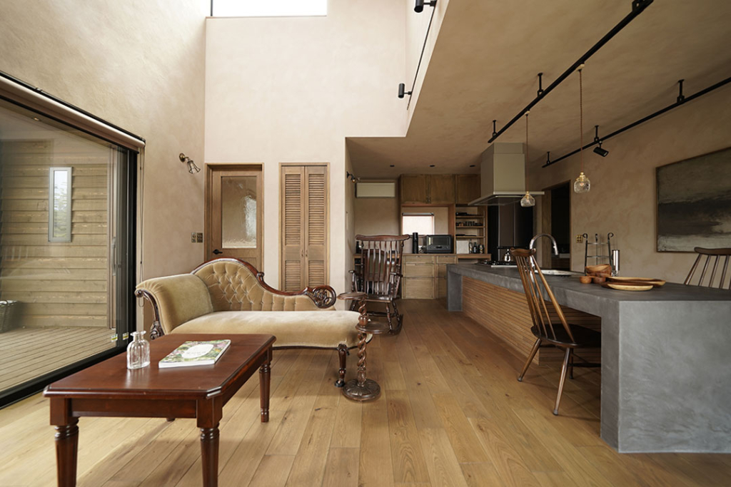 床は無垢のオーク材、壁と天井はエスタコウォールを使用。