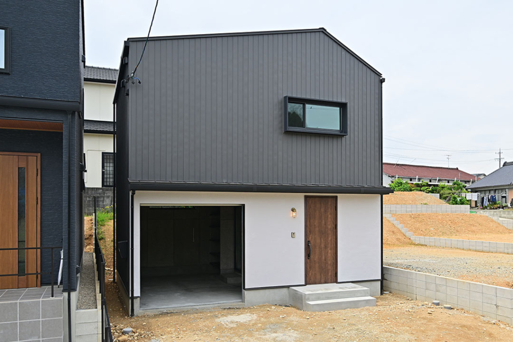 いぶし銀のガルバリウムと、エスタコウォールを使用した外観。
