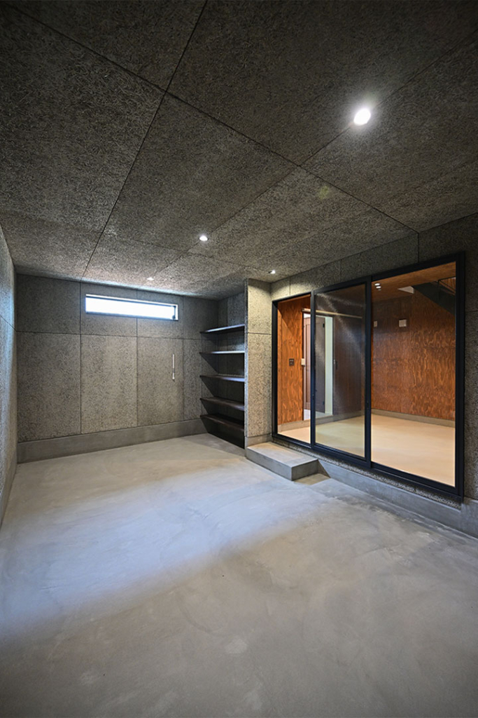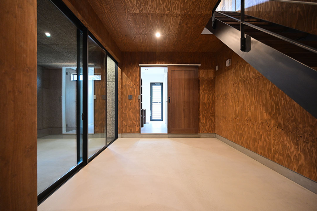 ガレージ・土間スペースからはトイレや洗面、お風呂などの水回りにつながっているので