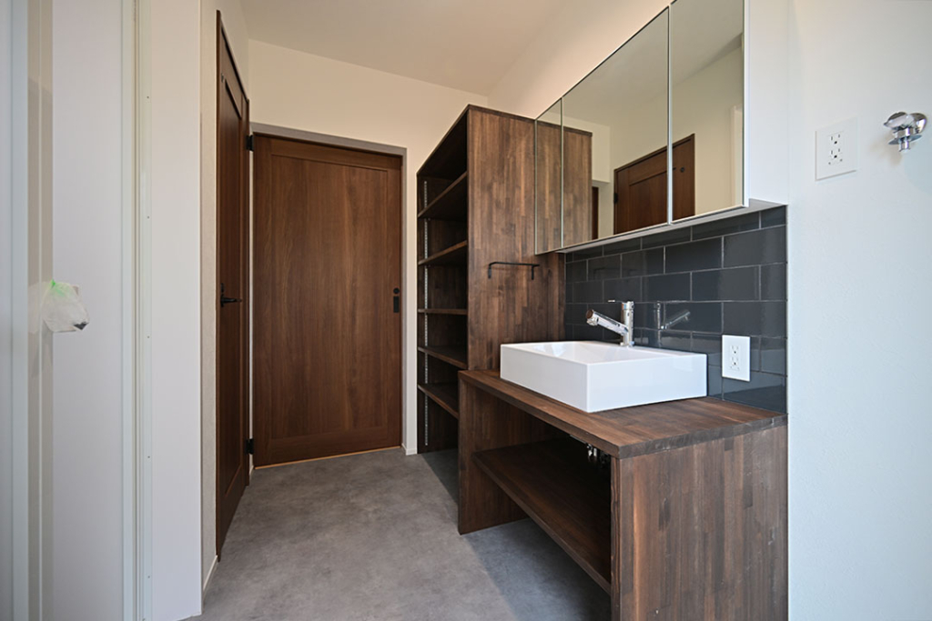 洗面化粧台と可動棚はホロスホームで造作。