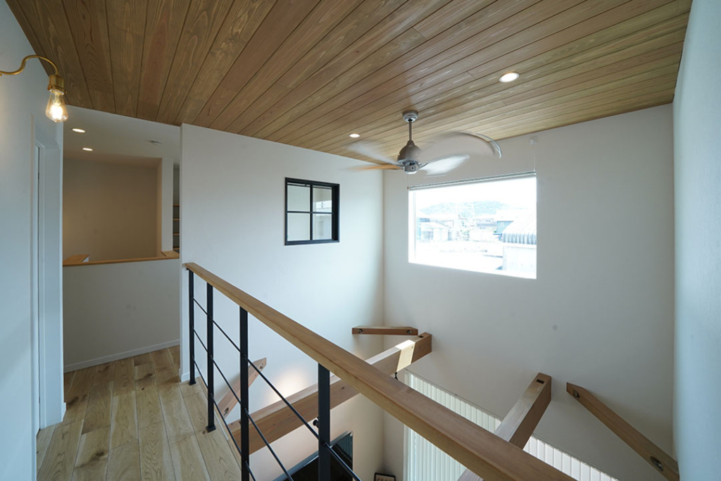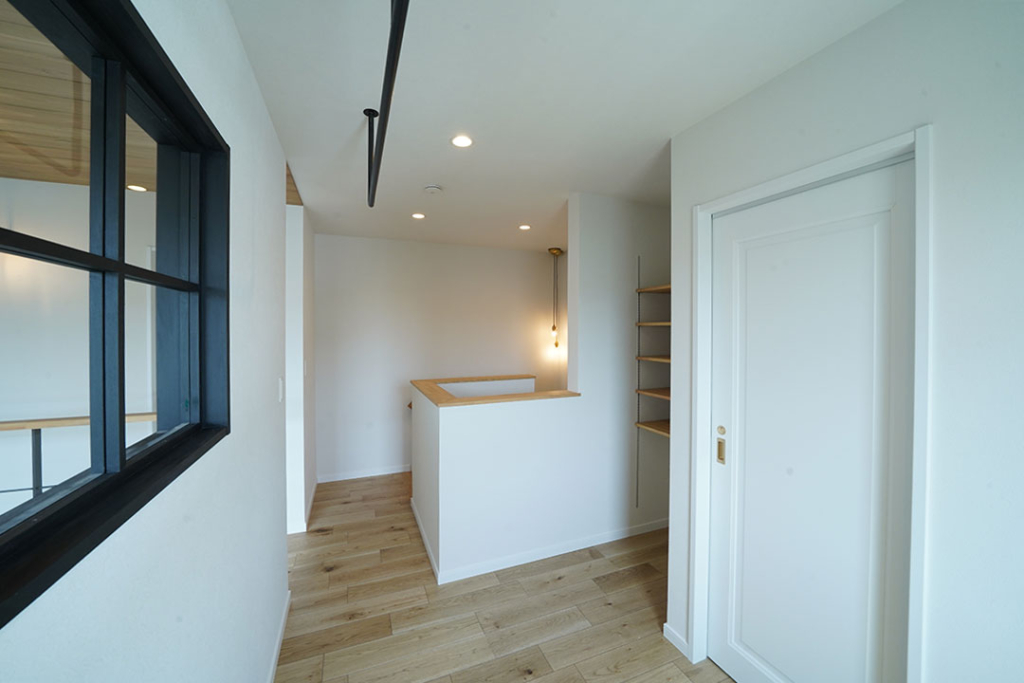 2階ホールはかわいい造作窓と、植物を吊るす用のアイアンパイプを設置しました。