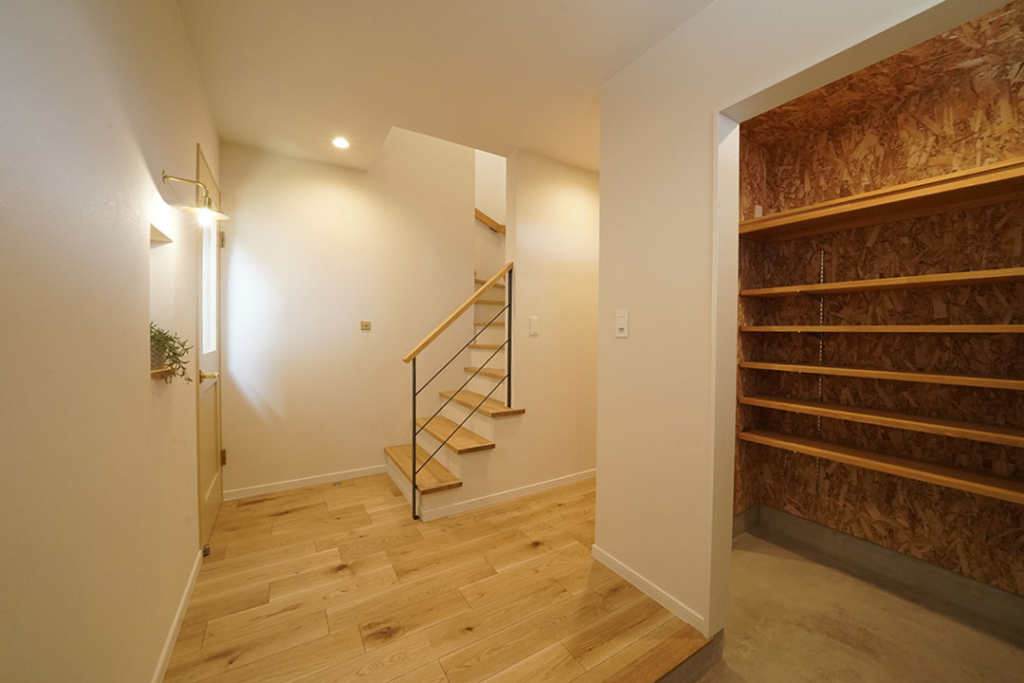 大容量のシューズクローク。ご主人様のご意向で、OSB合板を使用し無骨感を出しました。
