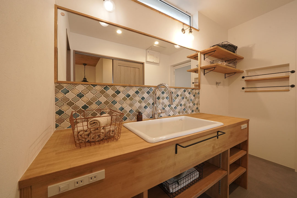 横に大きな一面鏡と、ビーチをイメージしたコラベルタイルが特徴の洗面スペース。