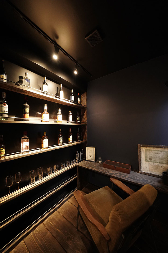 ブラックの壁紙と、古代色で塗装したオリジナルの棚やカウンターテーブルがカッコいいです。