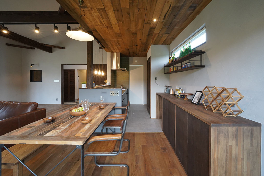 天井はダイニングキッチン部分だけ古風板を使用して、空間にメリハリを。
