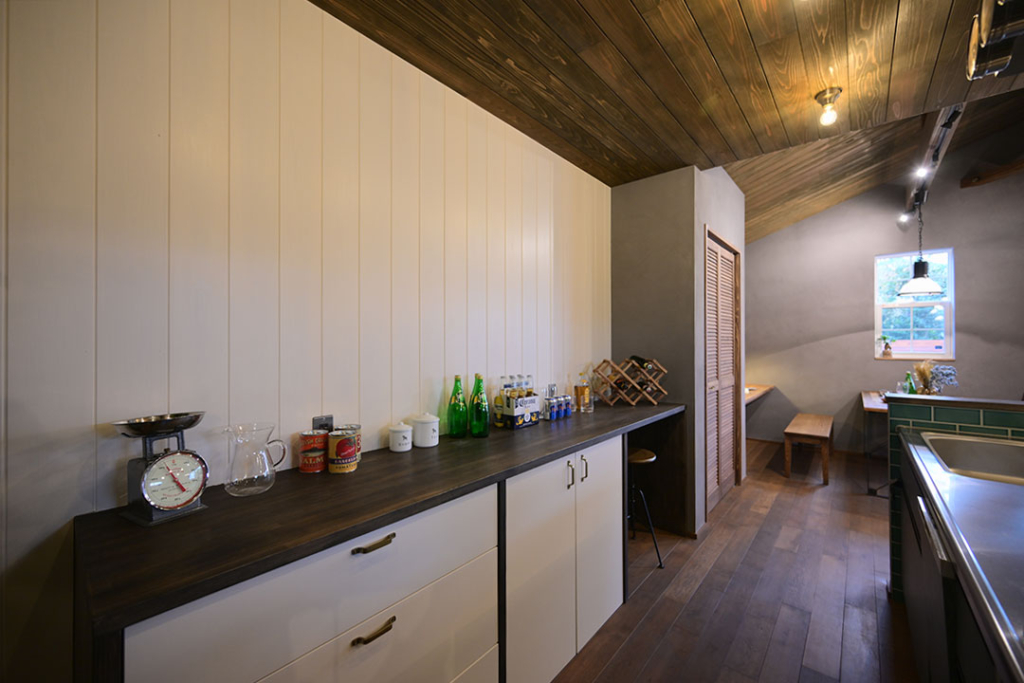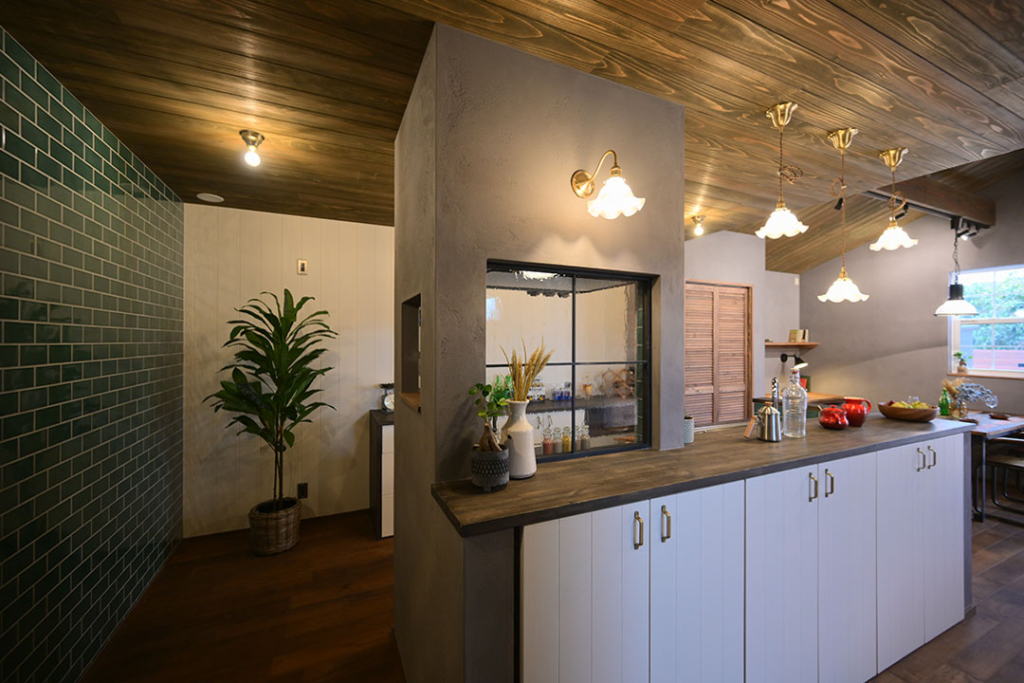 内外を繋ぐモスグリーン腰板張り。SCL間仕切りは、アーチ垂れ壁+腰板高さ合わせウエスタン扉。