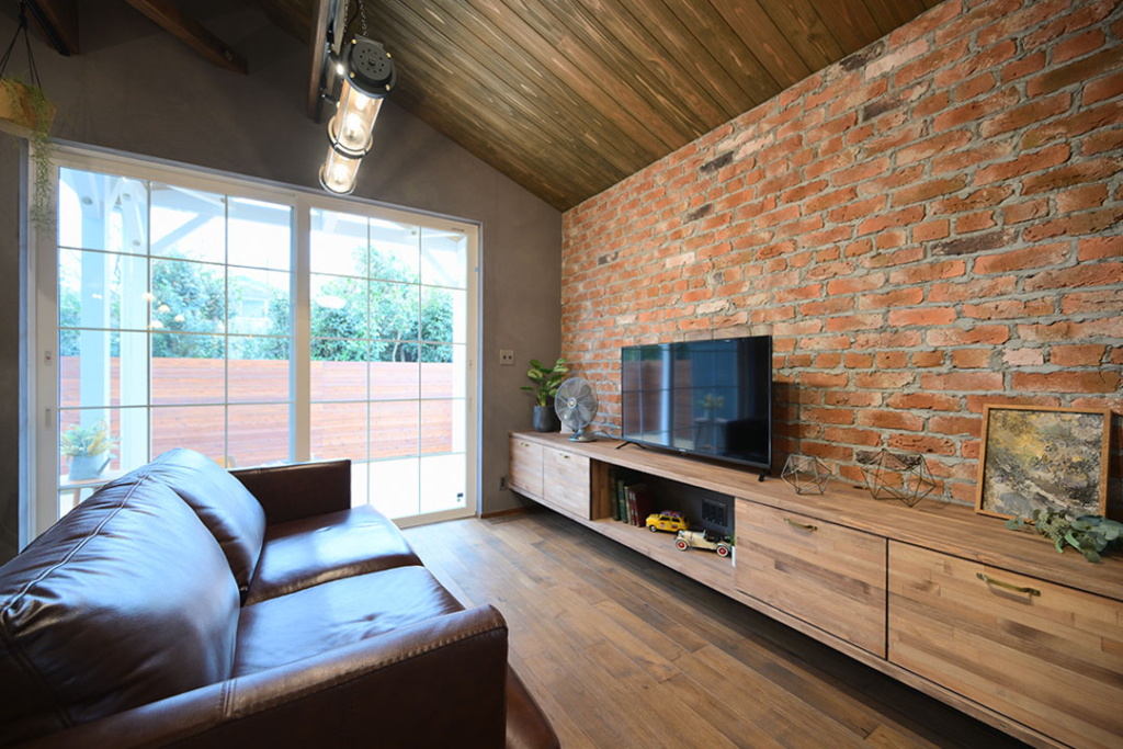 TV背面はアンティークレンガを模したブリックタイル。ブルックリンテイストを決める重要な素材です。