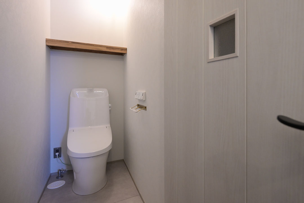 キッチン前内窓はウォーターガラスで汚れも目立たなく、「お帰り」が言える家族の気配が分かる設計。