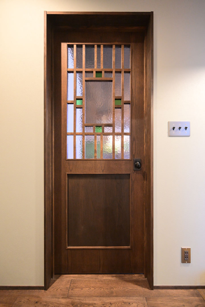 上部のガラスデザインは奥様の拘りで、建具屋さんとホロスガレージの共同製作しました。