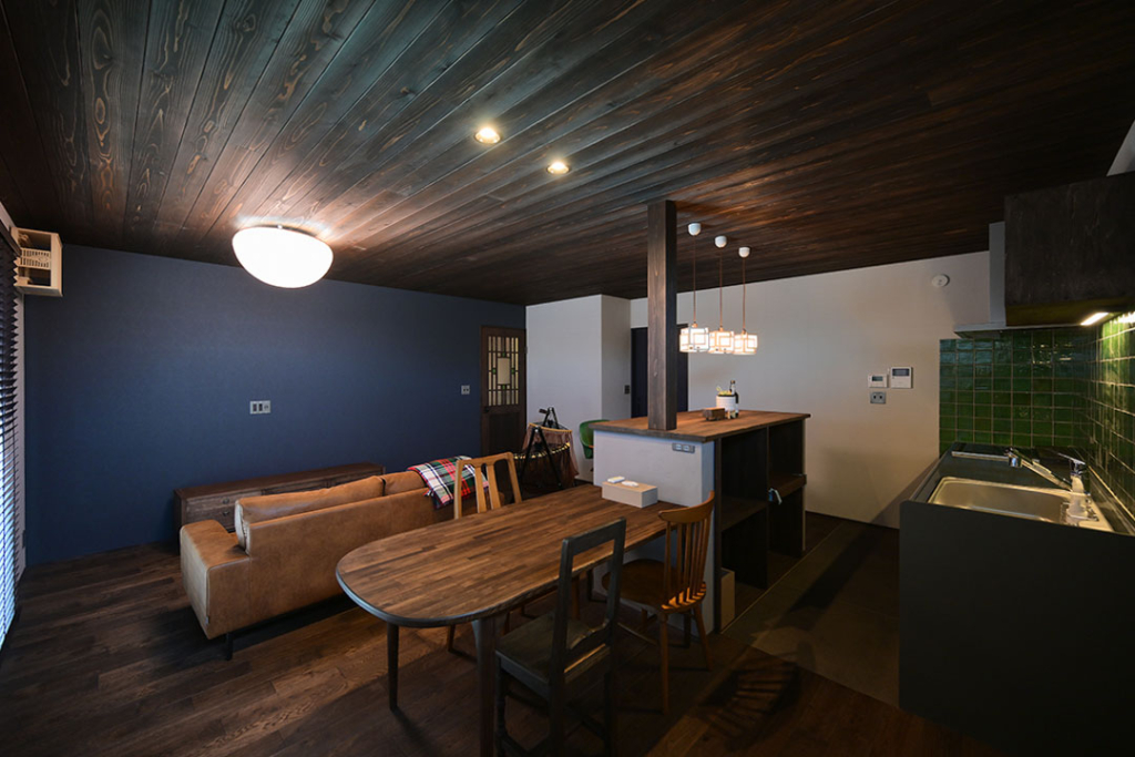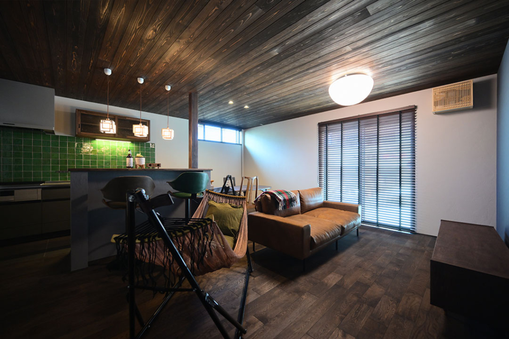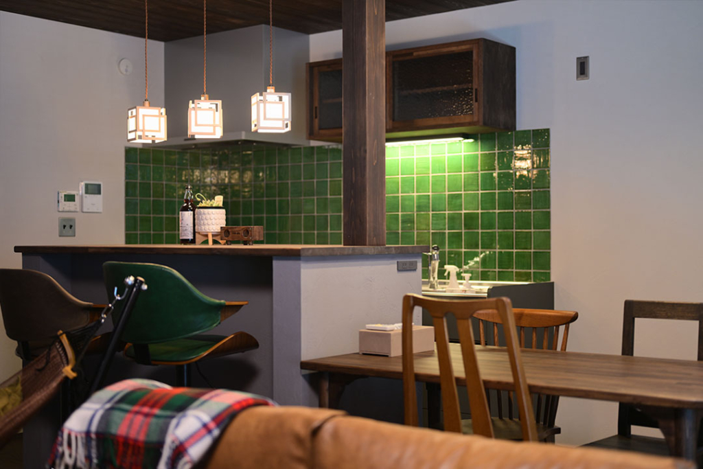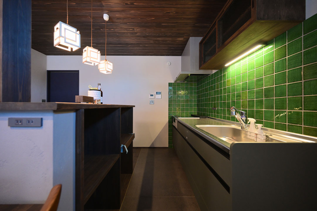 壁は漆喰、天井は杉板で自然素材をふんだんに採用。キッチン周りはグリーンのタイルでアクセント