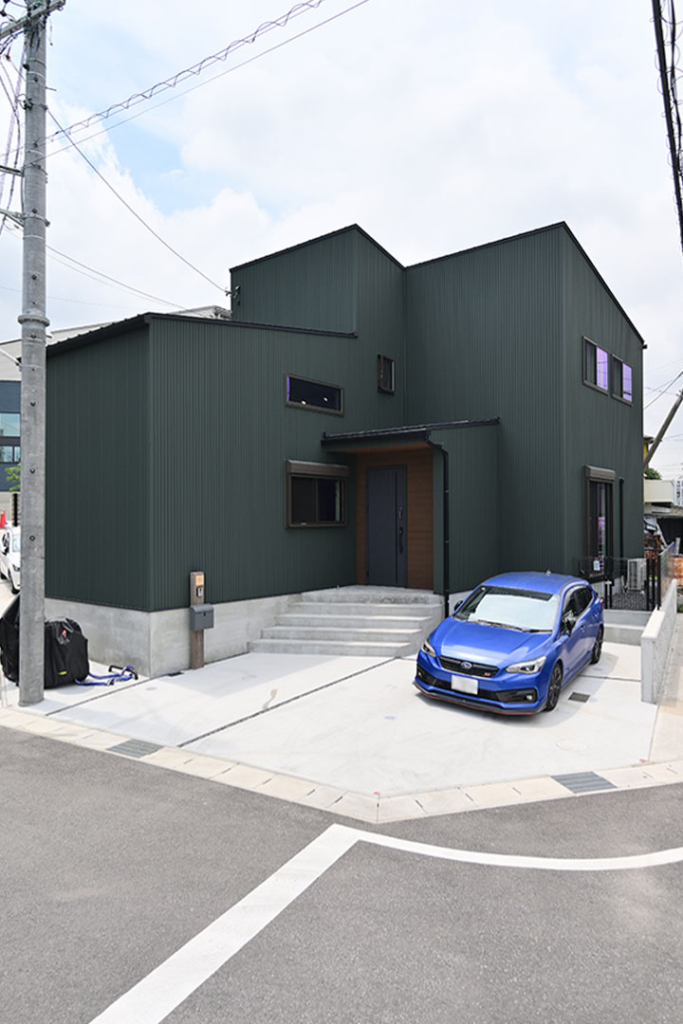 外壁はガルバのモスグリーン、玄関正面にT&Gパネル ベベルノッティでアクセントをつけています。