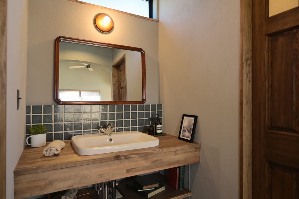 キッチンでも使っていたタイルと同じものを洗面スペースにも使用して統一感を図りました。