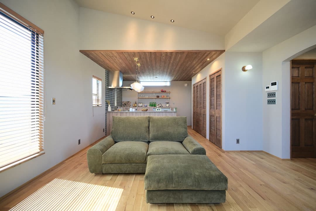 キッチンの下がり天井には杉板を用いて、メリハリをつけました。