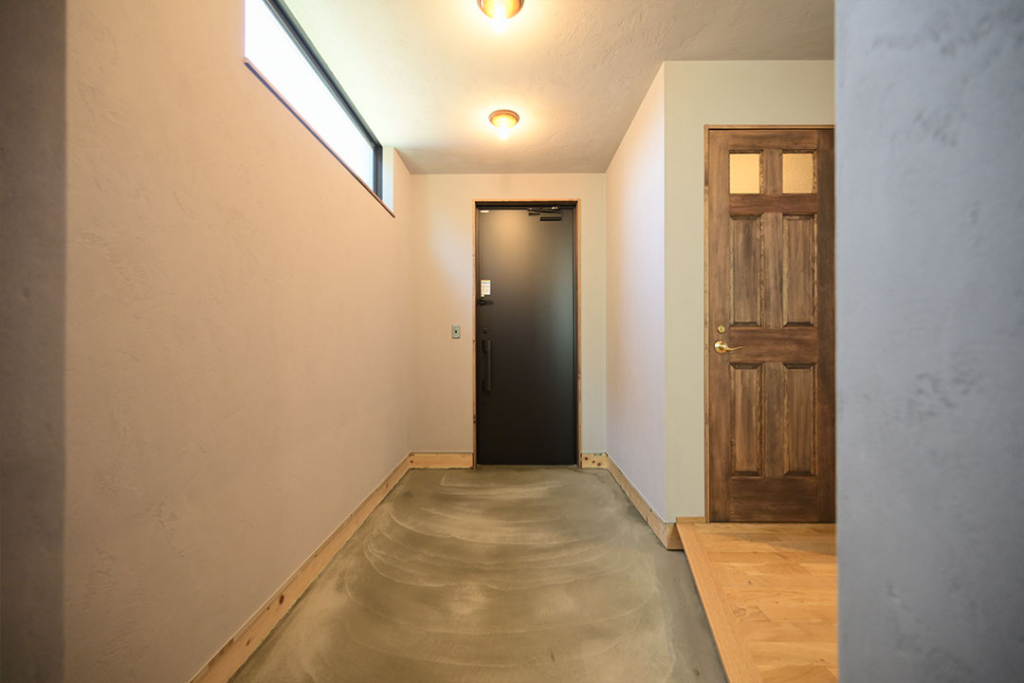 広い玄関土間にはベンチや姿見を置く予定。