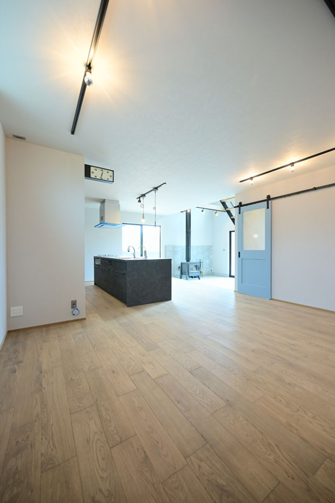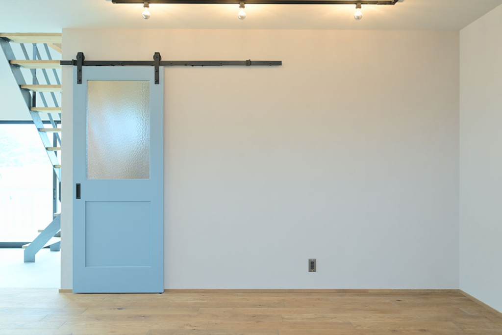リビングドアはライトブルーのバーンドアでかっこよく。