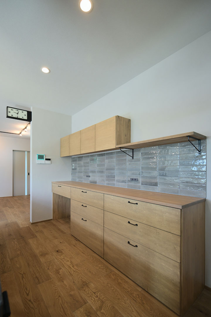 バックカウンターは造作で、たくさんの引き出しとゴミ箱スペースもご用意。